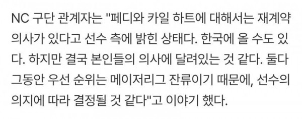 두 선수는 일단 12월이나 1월초까지 기다려 본다는 입장이라..NC는 규정상 11월말까지 라일리,데이비슨 재계약 의사 전달하고 페디,하트 리턴 분위기 봐서 협상하겠네요