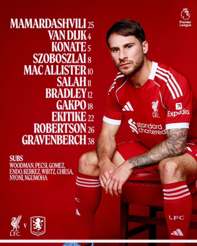 리버풀은 2일(한국시간) 영국 리버풀의 안필드에서 열린 2025-2026 잉글랜드 프리미어리그 10라운드 홈 경기에서 애스턴 빌라를 2-0으로 꺾었다.