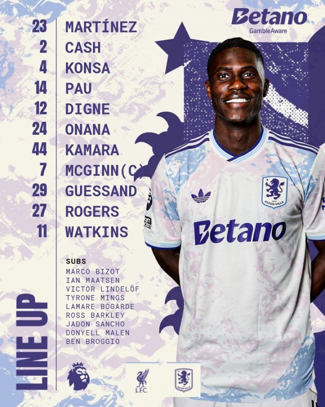 이에 맞선 애스턴 빌라는 올리 왓킨스와 존 맥긴, 모건 로저스, 에반 게상, 아마두 오나나, 부바카르 카마라, 뤼카 디뉴, 파우 토레스, 에즈리 콘사, 매티 캐쉬, 골키퍼 에밀리아노 마르티네즈가 선발 출전했다.