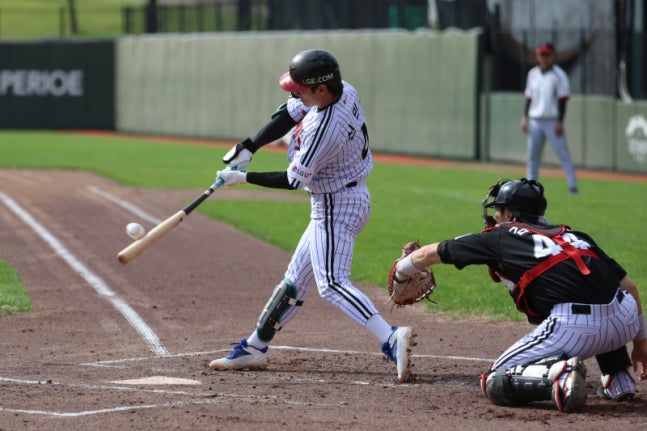청백전에서 타격 중인 신민재. 구단 제공