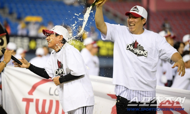 1일 잠실구장에서 정규리그 우승을 확정 지은 LG 트윈스. 염경엽 감독을 향해 김현수가 샴페인을 뿌리고 있다. 잠실=박재만 기자 [email protected]/2025.10.01/