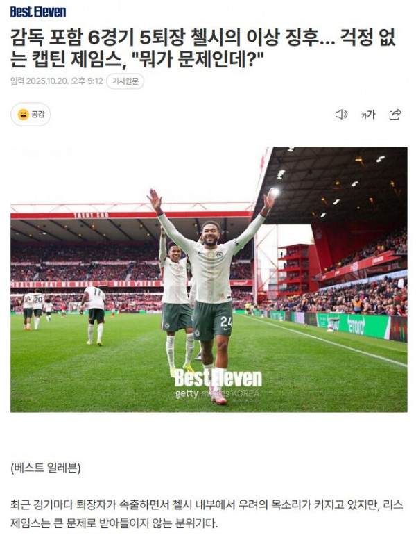 감독 포함 6경기 5퇴장 첼시의 이상 징후… 걱정 없는 캡틴 제임스, "뭐가 문제인데?"