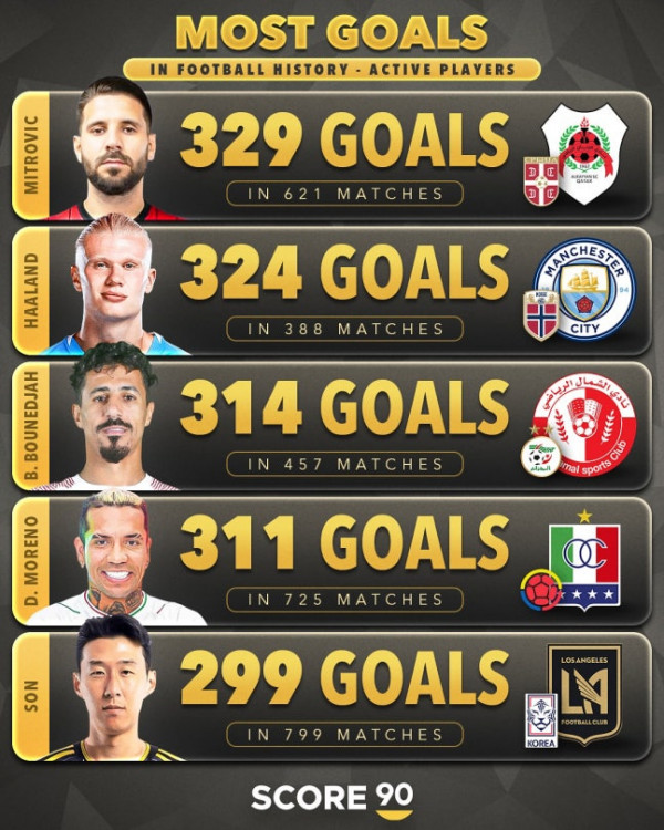 축구 콘텐츠 매체 SCORE90는 19일(한국시각) 현역 선수 중에 가장 많은 득점을 터트린 선수 1위부터 30위까지를 조사해 발표했다. 축구 통계 매체 트랜스퍼 마크트의 기록을 기반으로 만들어졌다.
