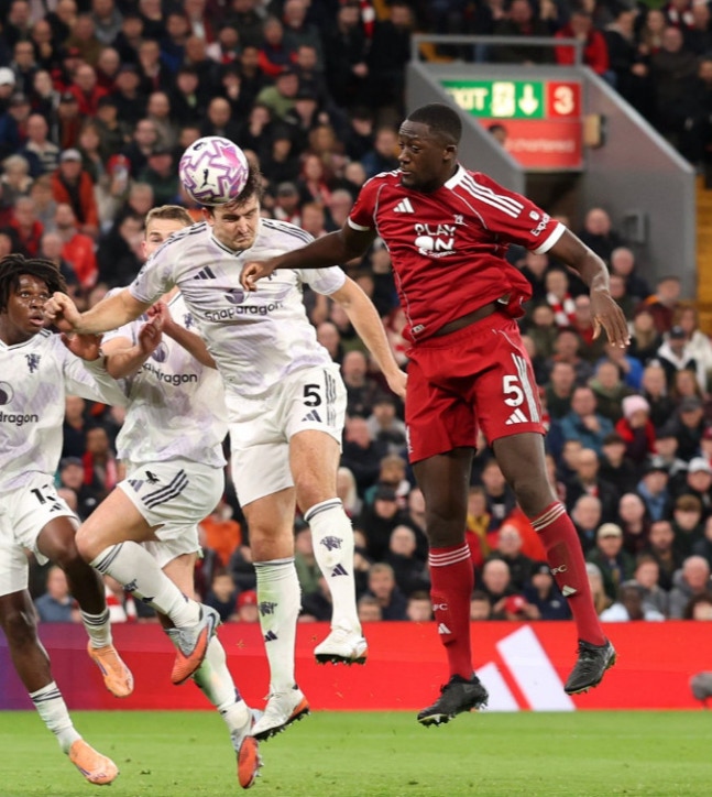 해리 매과이어(왼쪽)가 20일(한국시간) 영국 리버풀의 안필드에서 열린 '2025~2026시즌 잉글리시 프리미어리그(EPL)' 8라운드에서 헤더를 시도하고 있다. /사진=맨유 공식 SNS 갈무리