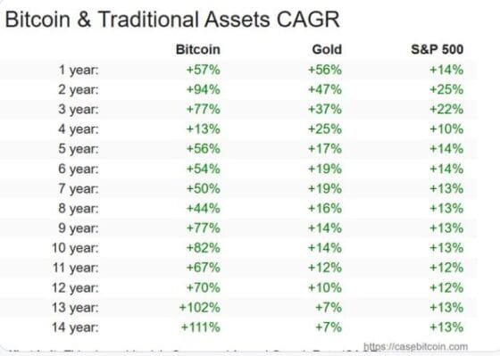 암호화폐 분석 플랫폼 케이스비트코인(casebitcoin.com)의 자료에 따르면, 비트코인의 누적 14년 연평균 복합 성장률(CAGR)은 111%에 달하며, 같은 기간 금과 S&P500의 수익률을 크게 웃돌았다. CAGR(Compound Annual Growth Rate)수치는 특정 기간 동안의 투자나 기업의 성장률이 매년 일정하다고 가정했을 때의 연평균 성장률을 의미한다. 수익이 재투자된다는 가정을 바탕으로 계산된 복리 효과를 포함한다.