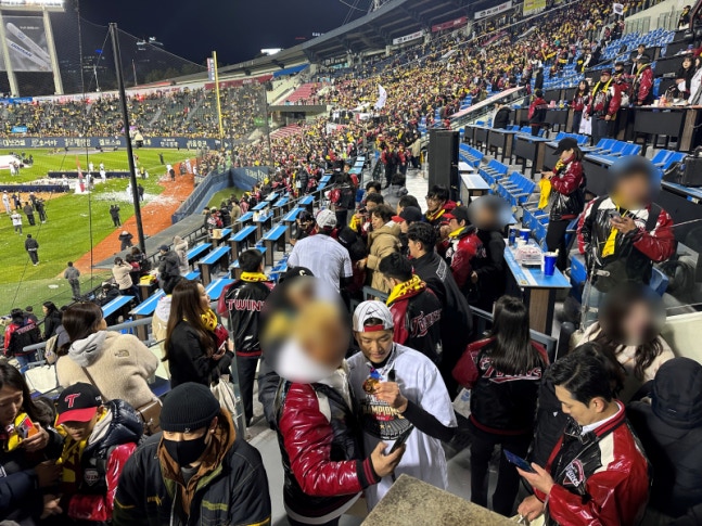 박해민이 2023년 한국시리즈 우승 후 관중석에서 팬들의 사진 요청에 응하고 있다. 잠실=이형석 기자