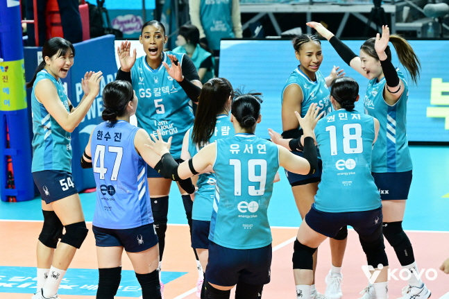 GS칼텍스 선수들이 19일 IBK기업은행과 개막전에서 득점 후 함께 기뻐하고 있다. /사진=KOVO 제공