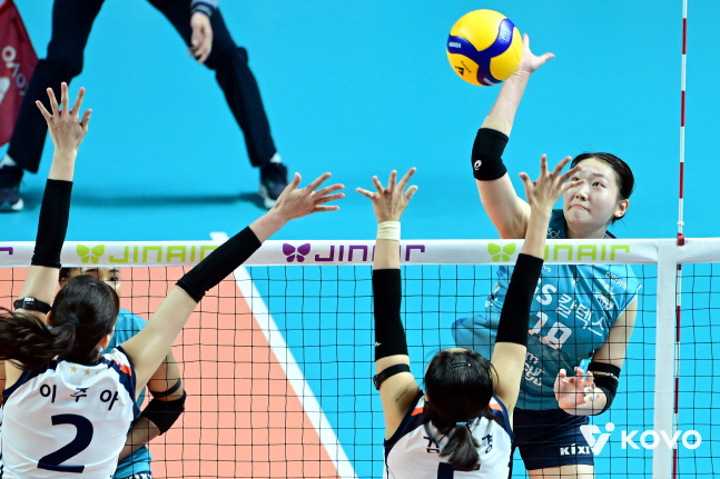GS칼텍스 실바(왼쪽)가 2명의 블로커를 앞에 두고 과감한 공격을 시도하고 있다. /사진=KOVO 제공