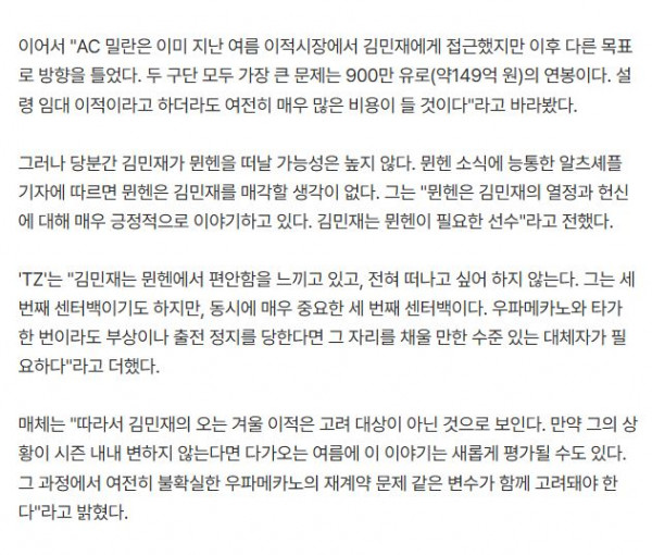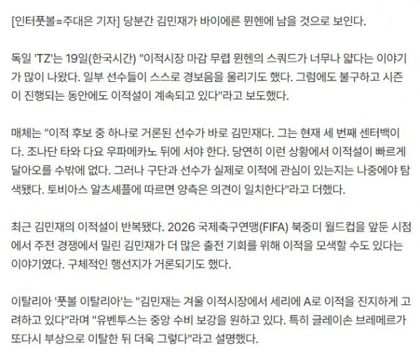 "중요한 세 번째 센터백" 김민재, 바이에른 뮌헨 안 떠난다…"구단이 긍정적으로 평가 중, 필요한 선수"