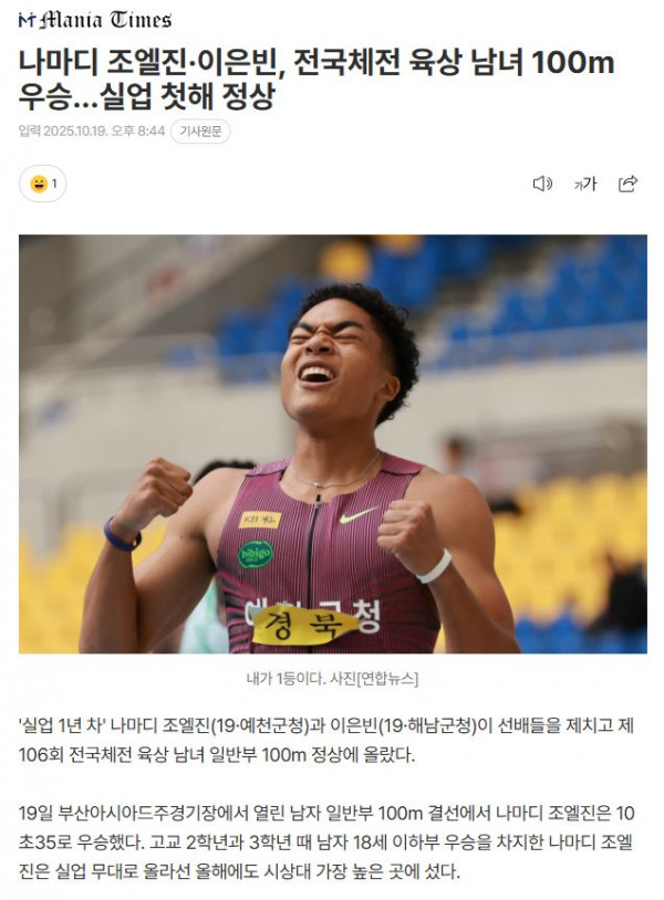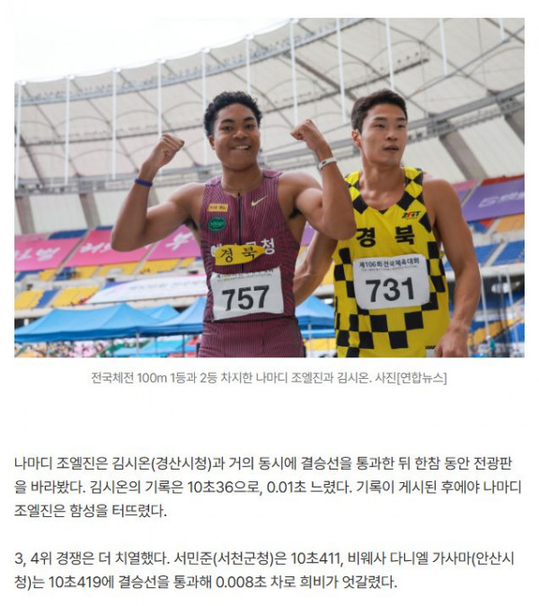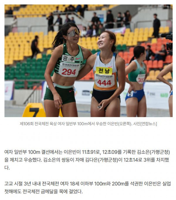 나마디 조엘진·이은빈, 전국체전 육상 남녀 100m 우승...실업 첫해 정상