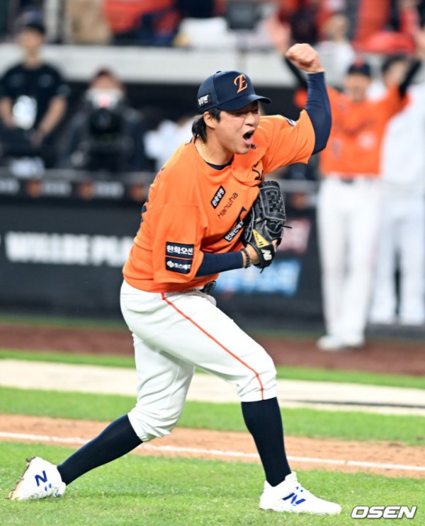 양상문 투수코치가 마운드로 향했고, 투수 교체였다. 좌완 김범수가 좌타자 상위타선을 상대하러 구원투수로 올라왔다. 김범수는 김지찬을 1루수 땅볼로 아웃을 잡고, 1루주자는 2루로 진루했다. 2사 2루 동점 위기에서 김성윤을 중견수 뜬공으로 처리하며 1점 차 승리를 지켜냈다. ⅔이닝 무피안타 무실점, 깔끔한 투구로 세이브를 기록했다.