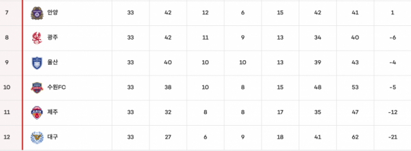 그럼 10위 수원FC(38점)와 어깨를 나란히 한다.