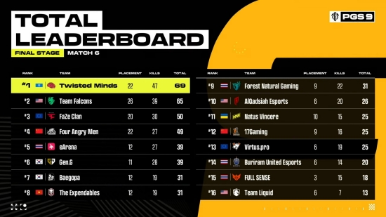 파이널 1일 차 경기 결과, 트위스티드 마인즈(TWIS)가 69점으로 1위에 올랐다. 그리고 팀 팔콘스가 65점으로 2위, 페이즈 클랜이 50점으로 3위, 포 엥그리 맨이 49점으로 4위, 이아레나가 39점으로 5위에 이름을 올렸다.