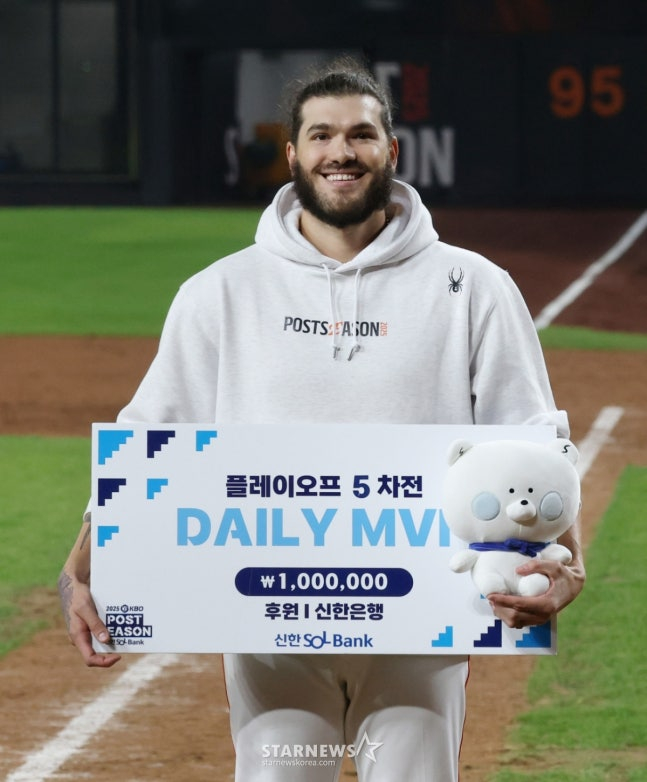 플레이오프 5차전 MVP를 수상한 폰세의 모습. /사진=김진경 대기자
