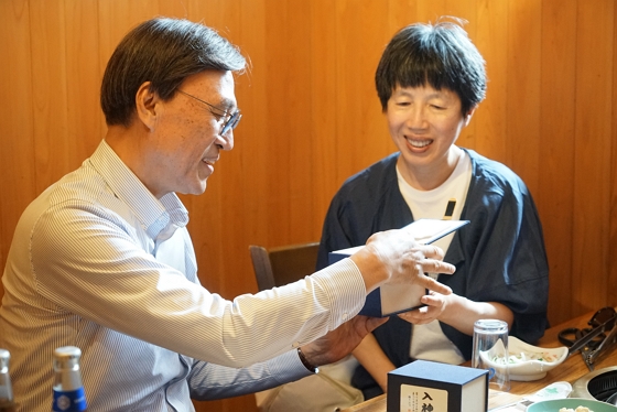▲ 경기 후 식사 자리에서 루이나이웨이 9단이 김준수 단장에게 직접 휘호한 찻잔을 선물했다.