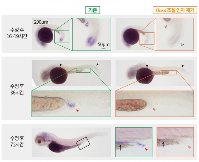 연구팀은 제브라피시와 생쥐를 대상으로 실험에 나섰다. 이들은 크리스퍼 캐스나인(CRISPR-Cas9) 유전자 가위를 이용해 Hox 유전자군 중 Hoxd 조절 인자를 제거했다. 그 결과 생쥐에서는 손가락과 발가락 부분에 결함이 생겼다. 반면 물고기에서는 예상했던 지느러미 대신 총배설강(소화, 배설 등을 처리하는 구멍) 쪽에 결함이 발견됐다.