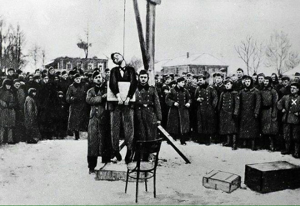 나치에게 붙잡힌 붉은 군대 정찰병 조이 코스모뎀얀스카야의 처형, 모두가 독일인 집에 불을 지른 자로 알고 있던 인물입니다. 바로 이것이 18세 소녀가 교수형에 처해질 때 목에 걸려 있던 팻말에 적힌 내용이었습니다.하지만 그 전에 조이는 고문을 견뎌야 했습니다_ 처형 전날 밤 그녀는 잔인하게 구타당했고, 옷을 모두 벗겨진 채 맹추위 속에 밖으로 끌려나가 서 있어야 했습니다.