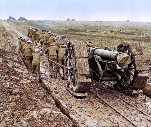 영국 군인들이 1320킬로그램짜리 곡사포를 도로를 따라 끌고 가고 있습니다, 1916년 9월.