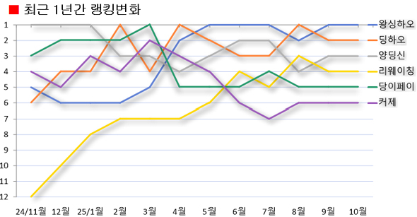 2025년 10월 중국랭킹에서 왕싱하오 9단이 2개월 연속 1위를 차지했다. 랭킹 점수는 5.6점이 빠졌으나 2위와의 격차는 전달보다 조금 더 벌렸다.