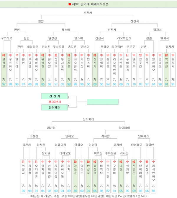 당이페이 9단은 패를 걸어간 것이 복잡하게 만들었다. 어지러운 팻감 공방에서 신진서 9단이 좀 더 주도면밀했다. 1국은 4시간 22분, 2국은 4시간 56분을 두었다.