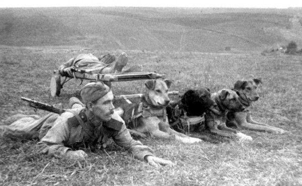 제1 우크라이나 전선 3군단 2특수부대 연대 군견 조련사 하사관 게오르기 콘드라티예비치 보리소프(1908년생)가 썰매 위생견을 이용해 부상병을 이송하고 있다.