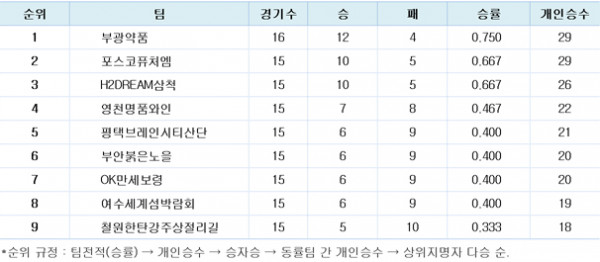 정규시즌은 9개 팀이 더블리그를 벌여 1~5위를 차지한 다섯 팀이 포스트시즌에 올라 계단식 대결로 최종 순위를 다툰다. 팀 상금과는 별도로 매판 승자는 130만원을, 패자는 40만원을 받는다. 미출전 수당은 10만원.