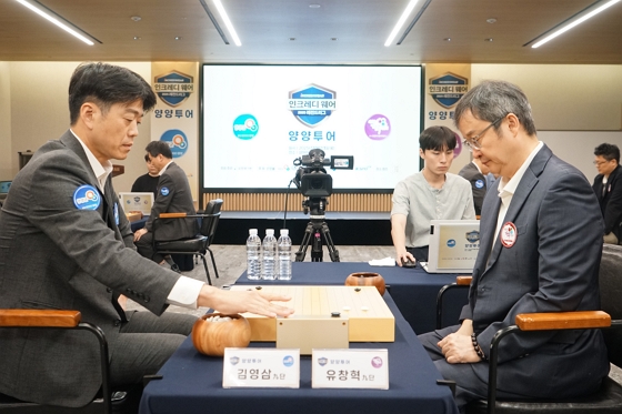 ▲ 세 판 다 동지명 대결로 펼쳐진 투어 경기 1국, 1지명 대결에서 김영삼 9단(왼쪽)이 상대전적 1승9패의 열세를 딛고 유창혁 9단에게 불계승, 양양의 승리를 견인했다. |