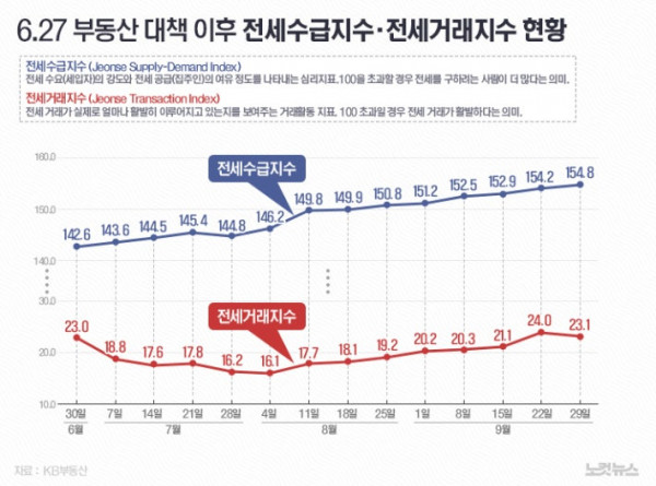 부동산 9월 주택가격 동향에서 서울 전세수급지수는 전월 대비 2.2p 오른 154.2를 기록했다. 전세수급지수는 100을 초과할 수록 '공급 부족' 비중이 높다는 의미다. 9월 전세수급지수는 2021년 10월(162.2) 이후 최고 수준이다. 주간으로 따져도 지난 6월 30일 142.6 수준이던 전세수급지수는 계속해서 상승곡선을 그리며 9월29일에는 154.8을 기록했다. 같은주 실제 전세거래 빈도를 뜻하는 전세거래지수는 100에 한참 못미치는 23.1을 기록했다. 전세거래지수는 100을 넘어설 경우 전세거래가 활발함을 의미한다.