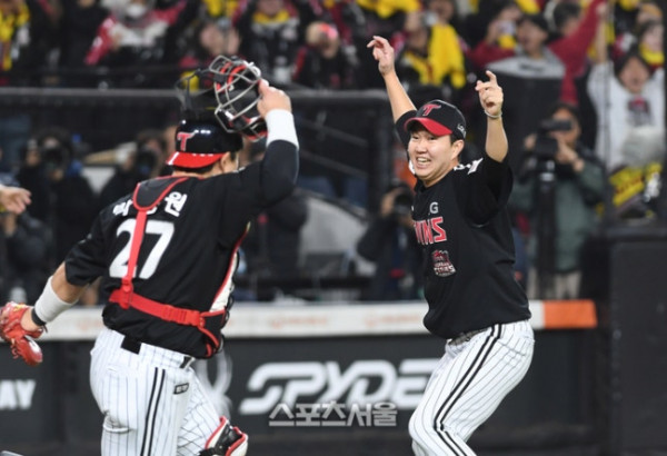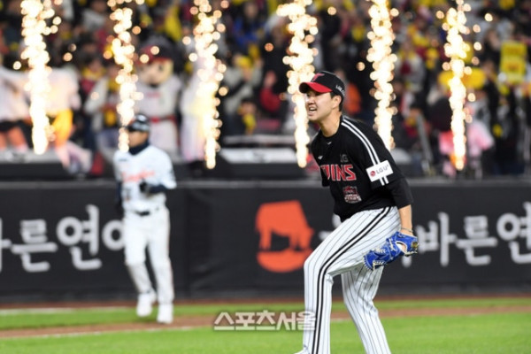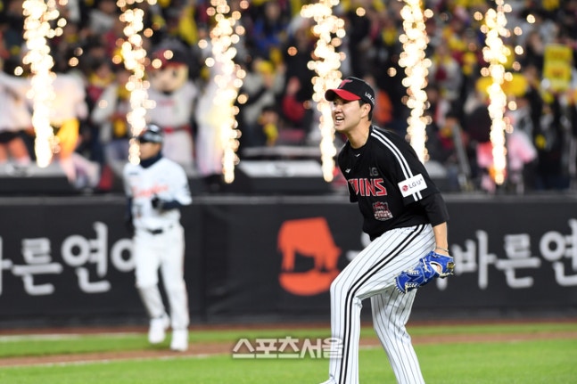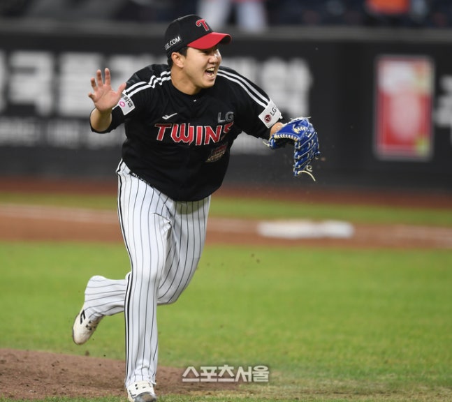 LG 유영찬이 31일 대전 한화생명볼파크에서 열린 2025 KBO 한국시리즈 5차전 한화와 경기에서 승리가 확정되자 환호하고 있다. 대전 | 최승섭기자 [email protected] |