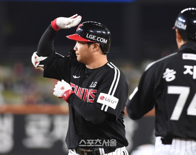 LG 문보경이 30일 대전 한화생명볼파크에서 열린 2025 KBO리그 한화와 한국시리즈 4차전 2회초 무사 한화 선발 와이스를 상대로 안타를 친 뒤 세리머니를 하고 있다.대전 | 박진업 기자 [email protected] |