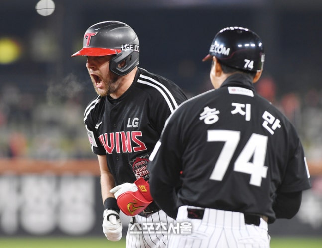 LG 오스틴이 30일 대전 한화생명볼파크에서 열린 2025 KBO리그 한화와 한국시리즈 4차전 9회초 2사 3루 상황에서 1타점 적시타를 친 뒤 포효하고 있다. 대전 | 박진업 기자 [email protected] |