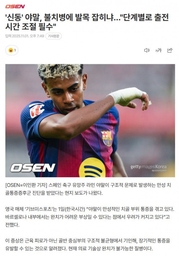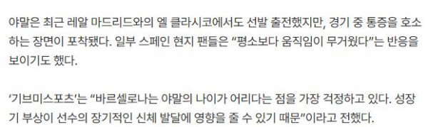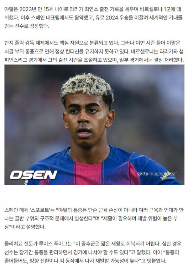 '신동' 야말, 불치병에 발목 잡히냐..."단계별로 출전 시간 조절 필수"