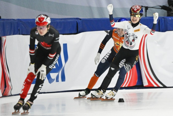 여자 3000m 계주 우승 이후 기뻐하는 김길리. 사진 | 몬트리올=AP연합뉴스 |