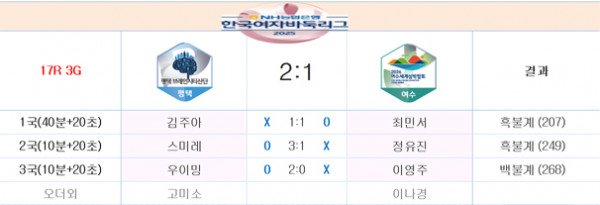 10일 저녁 바둑TV 스튜디오에서 열린 2025 NH농협은행 여자바둑리그 17라운드 3경기에서 평택브레인시티산단이 여수세계섬박람회를 2-1로 눌렀다.