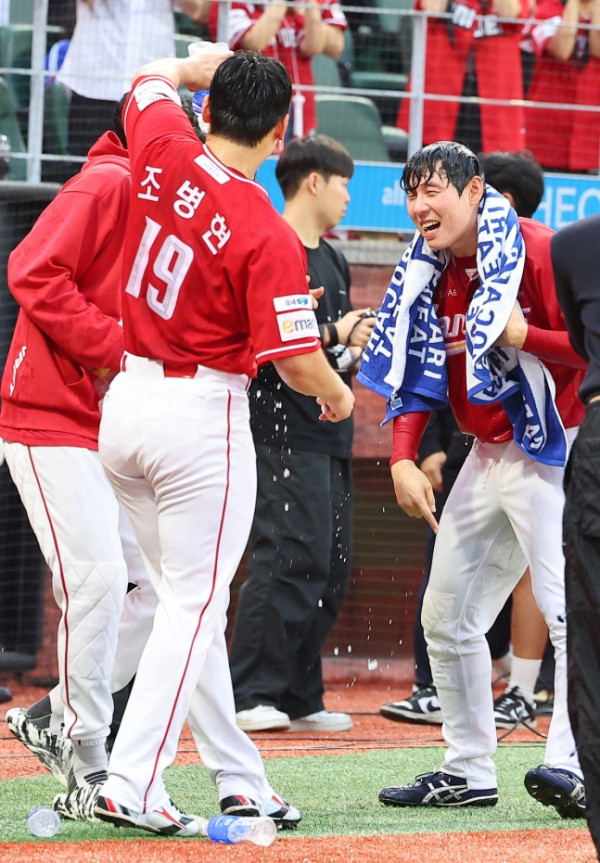 11일 인천 SSG랜더스필드에서 열린 2025 프로야구 KBO리그 포스트시즌 준플레이오프 2차전 삼성 라이온즈와 SSG 랜더스의 경기. 9회말 1사 SSG 김성욱이 끝내기 홈런을 친 뒤 동료들의 물세례를 받고 있다. 연합뉴스