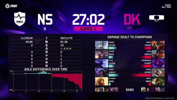 그러나 DK는 미드 교전 승리 후 탑에서도 득점을 올리며 분위기를 바꿨고, 17분에 드래곤 3스택을 쌓았다. 그리고 드래곤 영혼까지 가져가며 승기를 잡은 뒤 드래곤 영혼, 바론까지 챙기며 굳히기에 들어가 농심을 상대로 먼저 1승을 챙겼다.