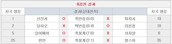1회 때 준우승과 2회 때 우승을 차지한 디펜딩 챔피언 신진서 9단은 2연패를 향해 한 발 더 다가섰다. 개인적으로 아직 달성한 적이 없는 메이저 세계대회 2연패를 란커배에서 이룰지 주목된다. 이 밖에 중중전으로 치른 8강전에서 당이페이 9단이 쉬자양 9단을, 리친청 9단이 딩하오 9단을, 판인 8단이 왕스이 8단을 눌렀다.
