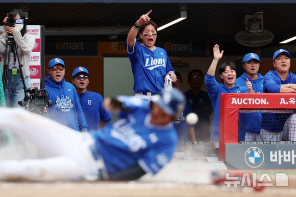 [인천=뉴시스] 조성우 기자 = 9일 인천 미추홀구 SSG랜더스필드에서 열린 2025 KBO 포스트시즌 준플레이오프 1차전 삼성 라이온즈와 SSG 랜더스의 경기, 삼성 4회초 공격 무사 주자 1루서 디아즈의 1타점 적시2루타 때 박지만 삼성 감독과 선수들이 1루 주자 구자욱의 홈인 장면을 지켜보고 있다. 2025.10.09. [email protected]