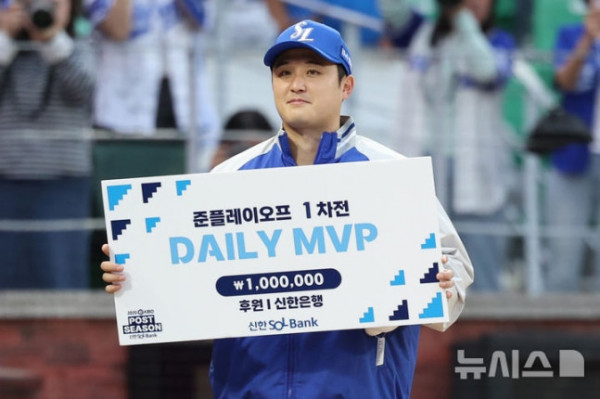 [인천=뉴시스] 조성우 기자 = 9일 인천 미추홀구 SSG랜더스필드에서 열린 2025 KBO 포스트시즌 준플레이오프 1차전 삼성 라이온즈와 SSG 랜더스의 경기, 이날 선발 등판해 포스트시준 첫 승리를 기록한 최원태가 SSG에 5-2 승리한 뒤 MVP 수상하고 있다. 2025.10.09. [email protected]