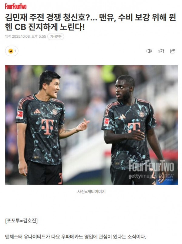 김민재 주전 경쟁 청신호?… 맨유, 수비 보강 위해 뮌헨 CB 진지하게 노린다!