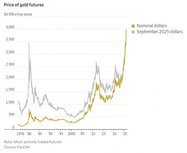 금 가격 추이(노란색). 2025년 달러 기준(회색). 자료=월스트리트저널