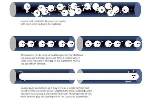 올해 수상자들은 이번에 초전도체 회로에서 전자들이 BCS 이론을 확립한 레온 쿠퍼의 이름을 딴 이른바 ‘쿠퍼 쌍’을 이뤄 마치 회로 전체를 채운 ‘단일 입자’처럼 행동하고, 절연체 장벽을 뚫고 반대편으로 이동하는 양자 터널링 현상을 보인다는 사실을 확인했다.