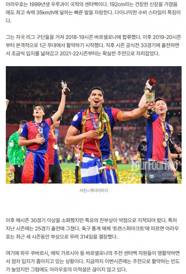 '김민재 자리' 생긴다! 바르셀로나, '유리몸 CB' 매각 결정…"이적료 '666억' 책정해"