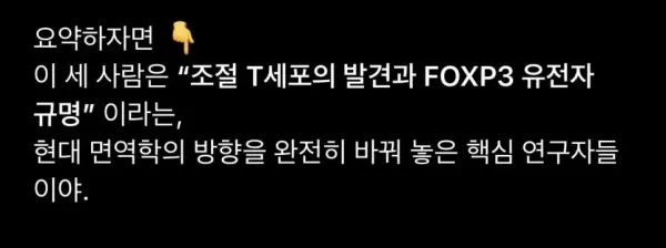 신체의 면역 체계가 스스로를 공격하지 않도록 하는 '말초 면역 관용'을 발견한 공로를 인정은