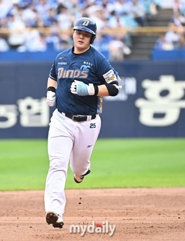 6일 오후 대구광역시 수성구 대구삼성라이온즈파크에서 진행된 '2025 프로야구 KBO리그 포스트시즌' 와일드카드 결정전 1차전 삼성라이온즈와 NC다이노스의 경기. NC 김형준이 5회초 1사에서 솔로홈런을 터뜨린 뒤 베이스를 돌고 있다./대구 = 송일섭 기자