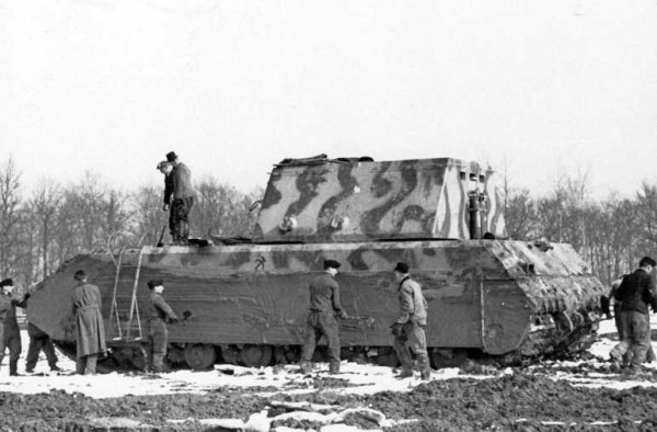 panzerkampfwagen viii «maus» (sd.kfz. 205, 프로토타입 v1) 초중량 전차 시험 사진_ 바로 이곳에서 장갑에 묻은 진흙을 제거하는 순간이 포착되었습니다. 독일 뵈블링겐, 1944년 3월 17일.