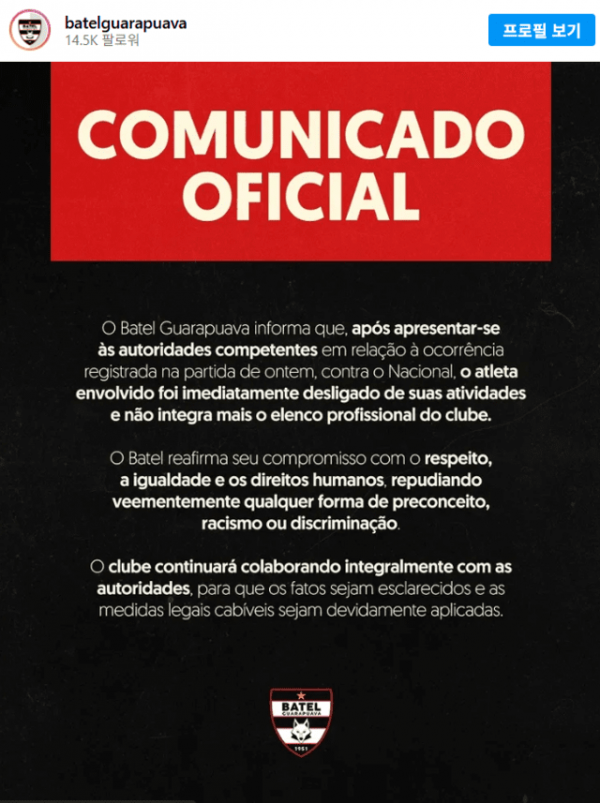 브라질 파라나주 축구협회 역시 별도의 성명을 내 "경기 중 발생한 불미스러운 폭력 사건은 인종차별 발언에 대한 반응에서 비롯됐다. 파라나 스포츠 징계위원회에 해당 사안을 회부했으며, 축구장 안팎의 폭력과 차별 모두에 반대한다"고 발표했다.