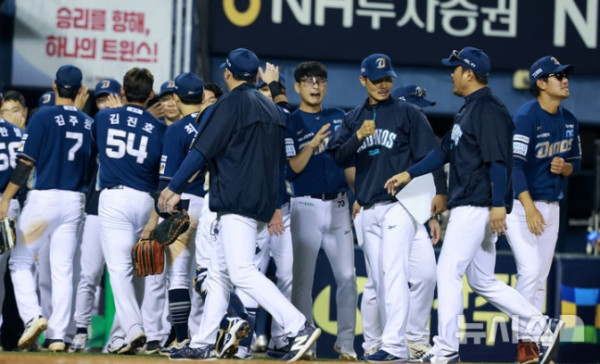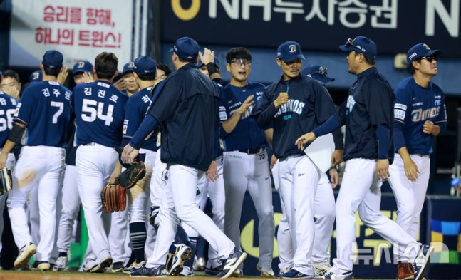 [서울=뉴시스] 이영환 기자 = 1일 오후 서울 송파구 잠실야구장에서 열린 2025 KBO 리그 NC 다이노스와 LG 트윈스의 경기, 7-3으로 승리한 NC 이호준 감독이 선수들을 격려하고 있다. 2025.10.01. [email protected]