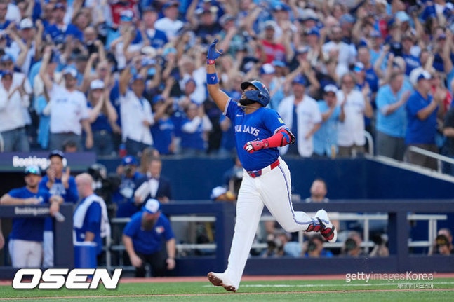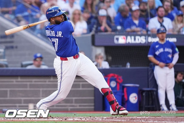 게레로 주니어는 14년 5억 달러(약 7300억 원) 연장 계약을 맺고 첫 시즌을 보냈다. 올해 정규시즌 타율 2할9푼2리 23홈런 84타점을 기록한 그는 시즌 막판 홈런이 좀처럼 터지지 않았다. 9월 6일 양키스 원정 이후 시즌 종료까지 홈런을 때리지 못했다. 하지만 포스트시즌 첫 경기에서 홈런 포함 맹타로 제 몫을 했다.