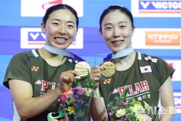 [수원=뉴시스] 황준선 기자 = 공희용, 김혜정이 28일 경기 수원실내체육관에서 열린 2025 세계배드민턴연맹(BWF) 월드 투어 슈퍼 500 코리아오픈 여자복식 결승전에서 일본 이와나가와 나카니시를 상대로 우승을 차지한 뒤 금메달을 들어보이고 있다. 2025.09.28. [email protected]
